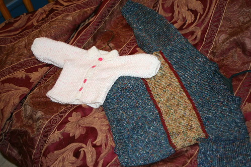 Some of my knitting was simply remaking a couple sweaters that didn't work out the first time and needed to rest in my basket until it was their time. These two turned out finally though, and I'm reasonably satisfied. I don't remember what the yarn is for the baby sweater and R's sweater is a discontinued Tweed.